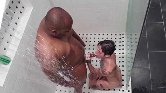 Баба в наколках шикарно ебется с негром в душе перед камерами